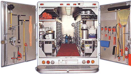 The famous box shape of our trucks allow our plumbers to sit in the cab of the truck, far from the potentially stinky plumbing equipment in the back.
